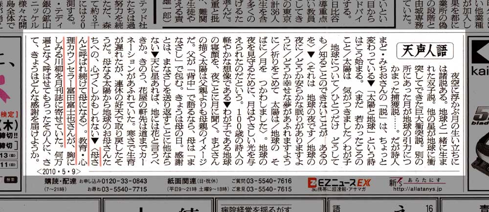 2010年5月9日付『朝日新聞』で富田先生の川柳が紹介!